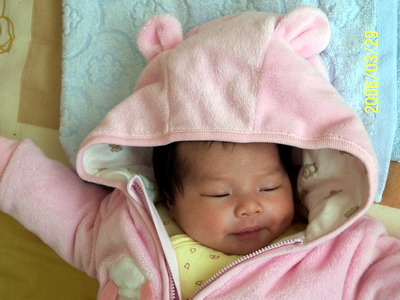 昨晚,又是我去值班陪方洁和多多,又和以前一样,每次我去值班,多多就不好好睡了,搞得我一夜没有睡好,方洁也很急。呵呵。不知道这是怎么回事。有意思的是,记得昨晚有一次,大概是半夜三点了吧,多多在吃饱后还在哭,我被搞得很烦,就大声的呵斥了一下,这小家伙居然好象能听懂似的,立马就止住了哭声,很安静了。呵呵。这个小家伙,夜里不好好睡后,白天倒是睡得很香,上午居然一睡就是三四个小时,如果是昨晚这样就好了。下图是小家伙上午睡觉的香甜样。